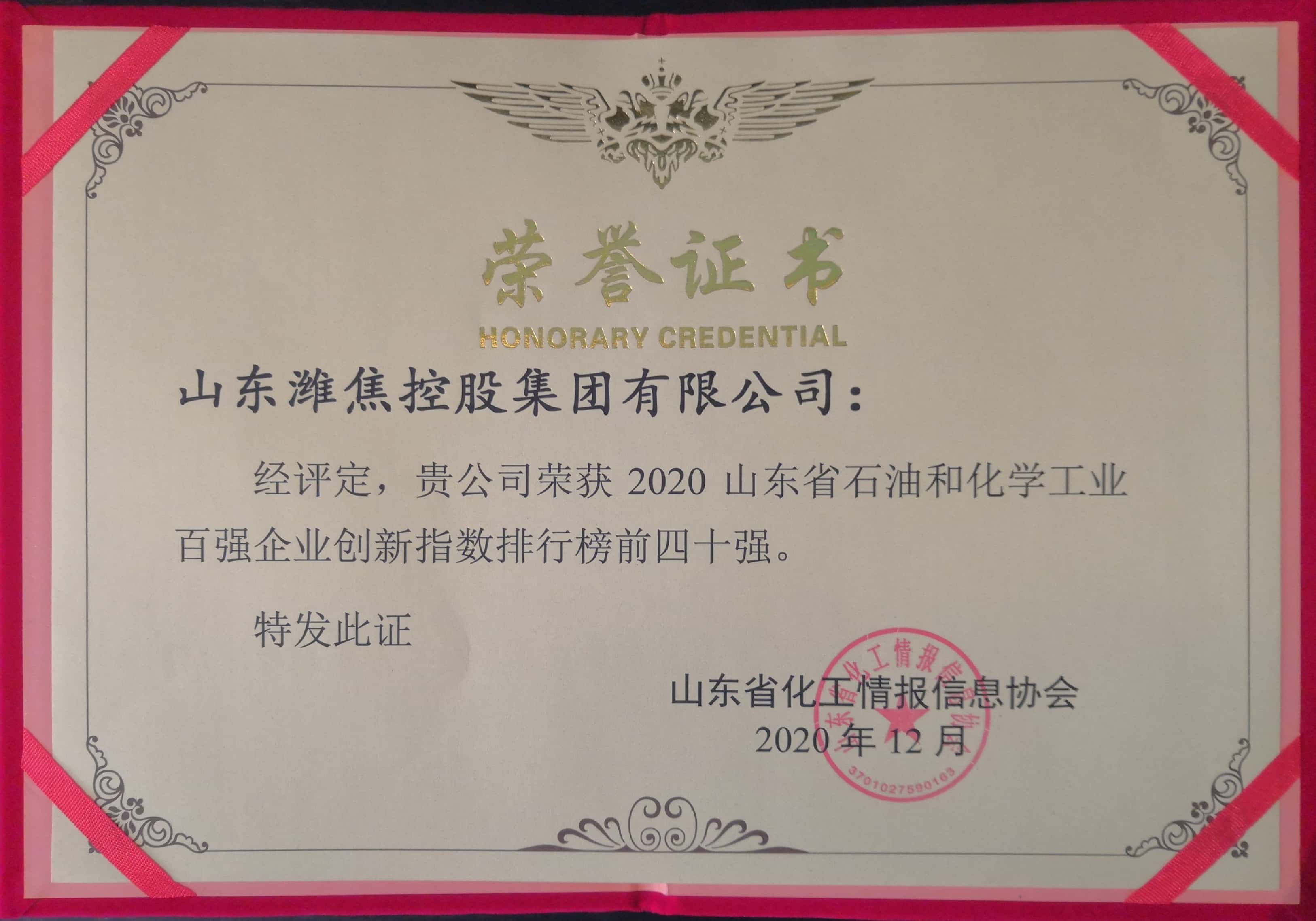 12月16日至17日,由山東省化工情報(bào)信息協(xié)會(huì)主辦的2020(第十屆)中國(guó)化工產(chǎn)學(xué)研高峰論壇在東營(yíng)廣饒召開(kāi)。會(huì)上,集團(tuán)公司榮獲“2020山東省石油和化學(xué)工業(yè)100強(qiáng)企業(yè)”稱(chēng)號(hào),并在百?gòu)?qiáng)企業(yè)創(chuàng)新指數(shù)排行榜位列35位。